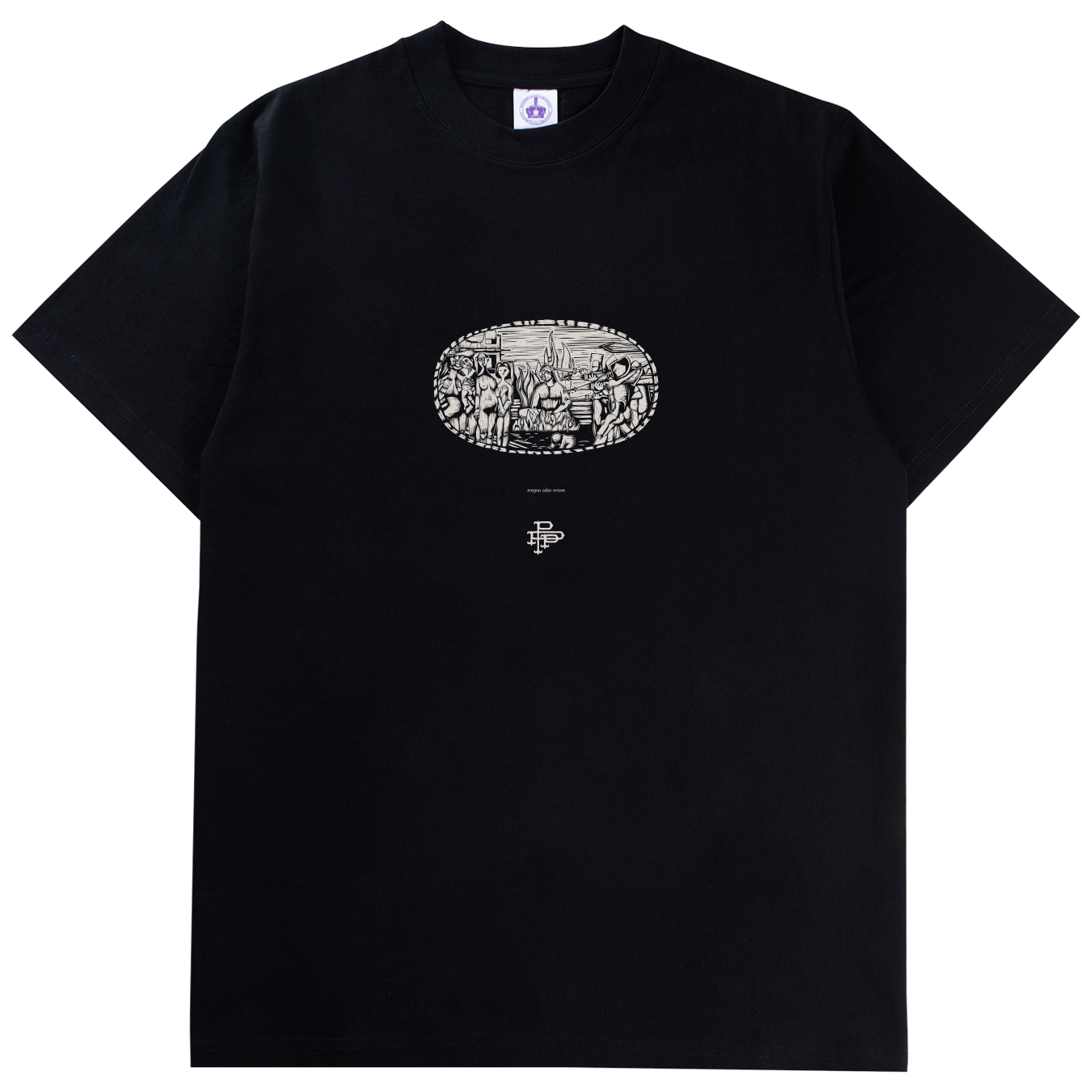 Unisex crewneck t-shirt with plastisol prints in front and back. Features graphic inspired by one of Pablo Picasso's anti war paintings; 'Massacre in Korea' as we ponder on the cycle of uncertainty happening in the world today. Made with 100% cotton. Regular fit. Pre washed to minimize shrinkage. View size chart for detailed measurement guide. Designed by Pleasure Palace Publication.